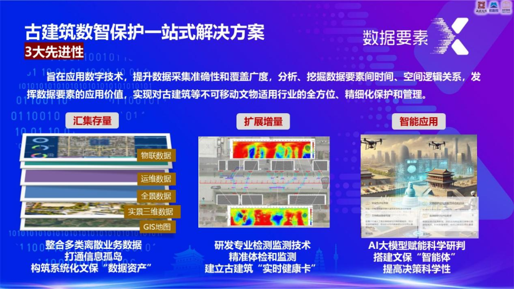 方案團隊將多年來在西安城墻的研究成果提煉轉化,依托“數字方艙”綜合管理平臺為基石,通過“1個數據底座”“1套管理平臺”互聯互通,將城墻隱患排查成果、監測研判成果、預防性保護成果等應用于“4類核心場景”,充分發揮數據要素的應用價值,著力推進科學技術對文物事業發展的支撐引領作用,以數據為關鍵要素的數字文保產業,推出“古建筑數智保護一站式解決方案”,實現對不可移動文物中古建筑、古遺址等文物保護領域及生態保護、自然遺產景區、水利水域風景區、文化旅游景區等領域的科學化精細化、系統化保護和管理。